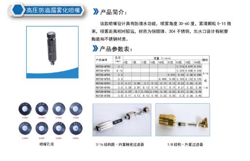 噴嘴選用:選用導流片式噴嘴,內(nèi)置精密過濾器,噴霧霧滴細小5-15um,工作壓力40-80公斤,流量60ml/min