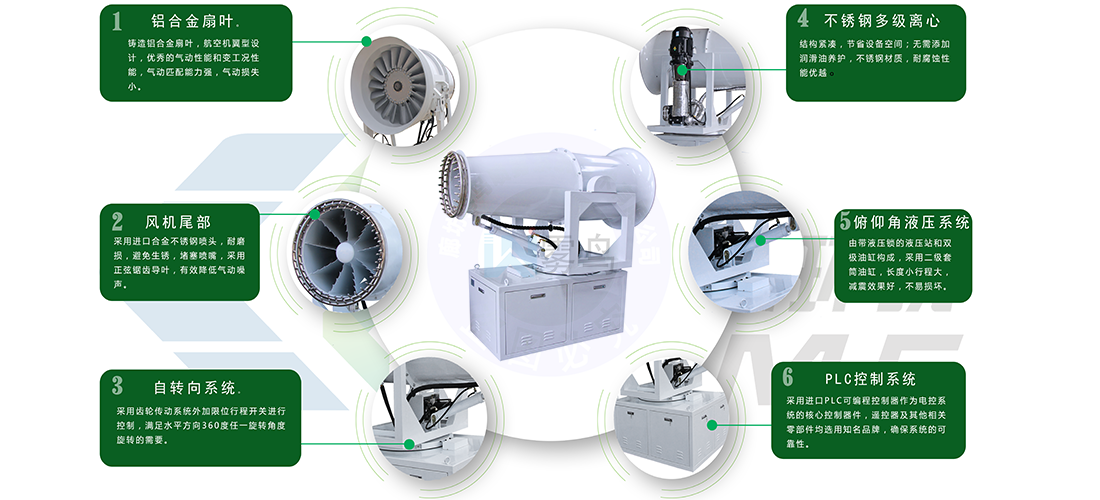 6、功轉(zhuǎn)換效率高、射程遠、覆蓋面積大、霧粒細小且均勻、抑塵效果好。水霧與飄在空中的塵埃接觸時,被塵埃所吸附,加大塵埃的比重,抑制塵埃在空氣中的流動,并加速塵埃沉降,實現(xiàn)對空氣的凈化。